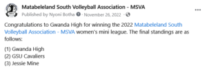 Matabeleland South Volleyball Association (MSVA) organises the MSVA League that spans from April to November every year. The MSVA League was formed on the 30th of November, 2013 and inaugurated in 2014 with the men’s category. The pioneer clubs were Izihlobo, ZRP Gwanda, Jessie Mine, Matopo Dolphins and Mzingwane Vipers.