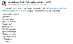 The 2023 MSVA League was won by Beitbridge Eagles, matches were played in the province’s major centres, namely, Colleen Bawn, Mtshabezi, Filabusi and Beitbridge.